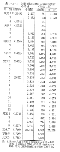 岡山市役所(昭和41年)の『岡山市史(産業経済編)』によれば慶安2年(1649)から延宝5年(1677)までの約30年間の備前国における牛馬頭数の推移を,表1−3−1のように示し,「慶安2年(1649)から寛文5年(1665)までの僅か16年間に,牛馬数が60%増加した。これは,従来の鍬中心の耕作から犁中心へと発展したことを物語るものである。そして,前期においては中後期に比較して馬の割合が多く,初め約30%を占めていたものが,その後漸減して20%強となっている。これは,当時1筆の田畑面積が,相対的に広かったなどの原因により,馬耕の割合が多かったため」としている。