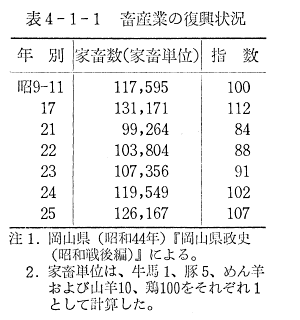 さて,戦後における岡山県の畜産のすう勢をみれば,戦中から戦後にかけての飼料不足と終戦直後の社会的混乱の中で,家畜数は激減し,昭和21年(1946)には99,264頭(家畜単位)という最低を記録した。その後の畜産の復興状況をみれば,家畜の激減により取引価格が暴騰したことで,投機的な面が強かったとはいえ,農家の畜産熱を高めることになり,飼料事情の好転と相まって,次のように昭和24年(1949)には,早くも戦前の水準に回復した。(表4−1−1参照)