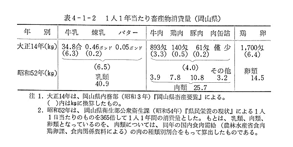 昭和32年(1957)9月,農林省岡山統計調査事務所の実施した緊急センサス準備調査の結果によれば,従来の役畜から用畜へと,畜産のすう勢が変化し,乳牛は1万頭をこえた。一方,和牛は昭和29年(1954)度の117,000頭をピークに,その後,動力耕耘機の進出による漸減の傾向となっている。