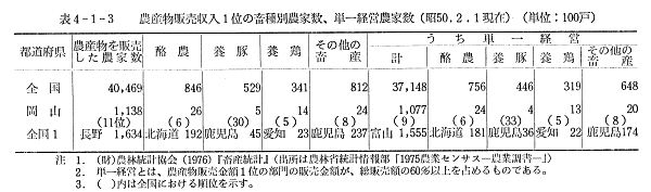 したがって畜産経営で所得をあげるためには,当然多頭羽飼養に向うことになるが,家族労働力の制約もあって,経営を単一化することになるのも当然であろう。本県の農産物販売総農家戸数に占める単一化した畜産農家戸数の割合は,全国または中四国地域の平均よりも高く,単一化傾向の強いことがうかがわれる。(筆者注 表4−1−3参照)