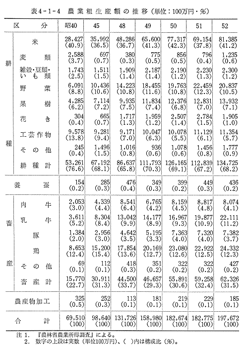 家畜および畜産物の粗生産額と,これが農業粗生産額のなかに占める割合についてみれば,表4−1−4のとおりである。すなわち,昭和40年(1965)には,畜産計158億円(鶏87億円,乳牛36億円,肉牛21億円,豚14億円の順位)で,農業全体のなかに占める割合は22.7%であった。同45年(1970)になると,畜産計309億円(鶏152億円,乳牛83億円,肉牛43億円,豚30億円の順位)となり,実数において5年間で約2倍近い増加を示し,とくに乳牛の伸びが大きかった。農業全体のなかに占める畜産の割合も,31.3%とかなり大幅に伸びている。同50年(1975)になると,畜産計559億(円鶏231億円,乳牛170億円,肉牛82億円,豚74億円の順位)と依然高い伸びを示しているが,同年における作物や園芸等耕種部門の伸びもまた大きかったので,農業全体のなかに占める割合は,30.6%であって,昭和45年(1970)以降はおおむね30%ていどと,ほぼ横ばい状態で推移している。