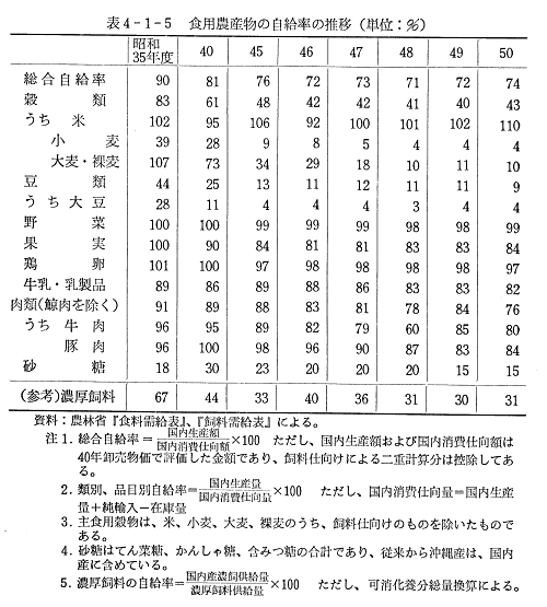ここで参考までに食用農産物の自給率の推移を示せば表4−1−5のとおりである。