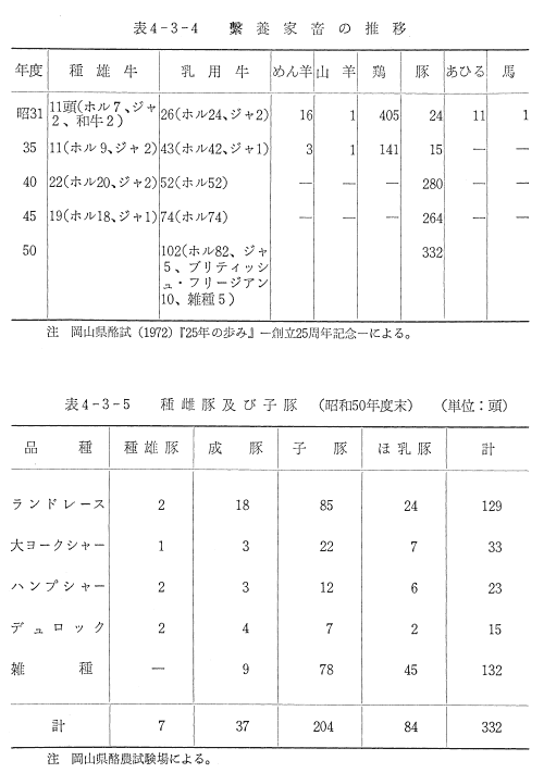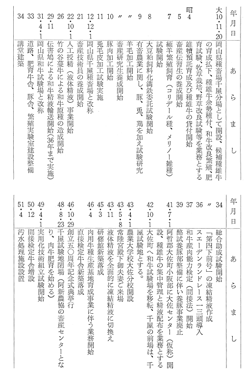 岡山県種畜場が,明治37年(1904)業務を開始して以来,大正10年(1921)同場千屋分場の開設と,これらの業務の概要については既述したところであるが,ここに改めて,これらを継承して,現在の酪農,養鶏および和牛の3試験場になるまでの沿革と現況(昭和52年)について,概要を記すと次のとおりである。(岡山県畜産会『岡山畜産便り』第28巻,第3号,昭和52年3月による)