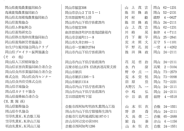 山陽新聞社(昭和30年)の『山陽年鑑』(昭和29年版)によれば,当時任意団体として次のようなものがあった。すなわち,岡山県家畜人工授精協会(会長惣津律士,県畜産課内),岡山県畜産振興会(会長土屋源市,県畜連内),岡山県酪農協会(会長奥山吉備男,県庁舎内),日本種豚協会岡山県支部(会長小川啓次郎,県畜産課内),岡山県緬蚕協会(会長中塚智雄,県蚕絲課内),岡山県養鶏協会(会長丸本市松,県畜産課内),岡山県家畜商組合(会長大河寅蔵,県畜連内)などであった。