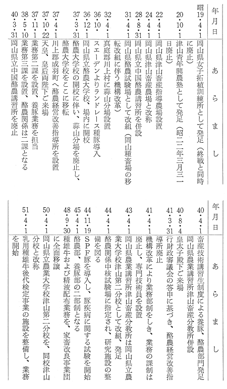 昭和43年(1968)4月1日,岡山県立農業大学校が,条例をもって赤磐郡赤坂町に設立された。これは,大正4年(1915)岡山県立農事試験場練習生(甲種農学校卒,1年修業,吉備郡高松町,現岡山市高松原小才)から発した岡山県立農業講習所(岡山市北方,現岡山市学南町)と,昭和9年(1934)三徳塾教育会(高等小学校卒,1年修業,上道郡角山村,現岡山市竹原)から発した岡山県立三徳農業研修所とが廃止され,これらに代って,農業者の中堅的担い手を養成する目的で新設されたものである。もともと耕種,園芸部門を主体としたものであったが,農業講習所には,昭和40年(1965)畜産文教所が3畜産関係試験場に併設されていた。