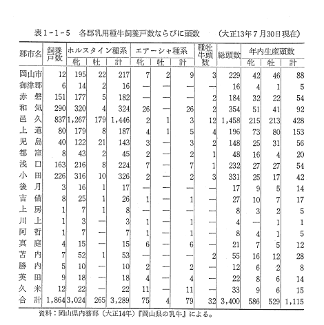 さて,同年7月における乳牛の郡市別飼養状況は表1−1−5のとおりで,総頭数3,400頭の分布は,前者と反対に,ほとんど南部に集中し,僅かにみられ中北部のものはほとんど搾乳業者の飼育するものであった。県内の営業者は136戸,その飼養頭数は1,011頭で,農家の副業的飼養は1,728戸,乳牛頭数2,389頭であった。これらの農家の実態をみると,乳用子牛を購入して育成し,妊娠牛として県外に移出するものがほとんどで,繁殖をするものは,ごくわずかであった。大正10年(1922)邑久郡に岡山煉乳株式会社が,翌12年(1923)小田郡に山陽煉乳株式会社が,それぞれ創立され,これによって,会社周辺の農家乳牛飼養は急増して,同10年(1922)に約600頭位であった乳牛が,同13年(1924)には1,400頭と実に2倍にもなったのである。これらの2つの会社は,当時県南部の副業的乳牛飼養の核心を形成したものである。