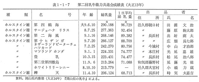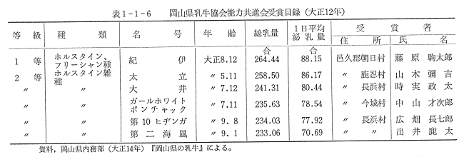 泌乳量の多少は,1日最多乳量のみでは判定できるものではなく,1乳期の総乳量によってその経済価値は定まるものである。しかし,長期間の乳量を記録したものが見当たらないので,当時の岡山県乳牛協会の能力共進会の成績によって,その能力を判断すれば次のとおりである。(この調査は,連続3日間の搾乳量を調査して1日平均量を求めたのであって,大正12年(1923)および13年(1924)度の成績中優良のものは表1−1−6および表1−1−7のとおりであった)