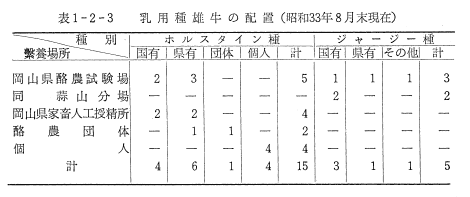 昭和31年(1956)4月,岡山県岡山種畜場は,津山市大田の岡山県津山畜産農場に,乳牛その他の酪農関係の施設を移して,岡山県酪農試験場として新発足した。都道府県で畜産関係試験場を設けたのは,本県がはじめてであった。