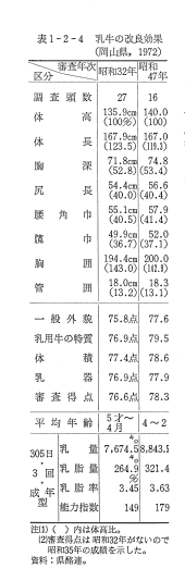 ここで乳牛の改良効果について見れば次のようである。県酪連が実施した高等登録牛の審査成績,能力検定成績を昭和32年(1957)(一部35年の成績)と昭和47年(1972)と対比すると,表1−2−4の通りである。なお,審査基準は体高138.0センチメートル(100),体長172.5メートル(125),胸深75.9センチメートル(55),尻長57.9センチメートル(42)腰角幅57.9センチメートル(42),胸囲202.8センチメートル(147),管囲18.6センチメートル(13.5)であるが,この基準に比べると,@体高は充分にある。A体長,尻長,胸囲が一般に足りない。(伸び,体積のないものが多い)。B得点は飛躍的によくなったが,一般外貌,乳器の改良が足りないという結果となった。