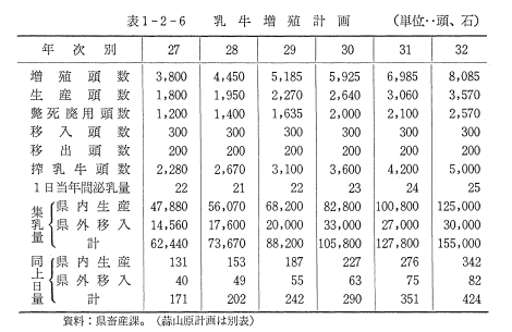 殊に酪農は,昭和30年(1955)に美作,同32年(1957)に備中,同34年(1959)に旭東の3集約酪農地域指定をうけ,その後酪農経営改善計画,酪農近代化計画が集約酪農地域を中心に画策され,重点的な助成の下に酪農振興が図られた。その結果,昭和30年(1955)の飼養農家は4,380戸,飼養頭数は,6,840頭であったものが,昭和46年(1971)には,5,480戸,4万5,400頭と6倍になり,西日本有数の酪農県となった。おもな酪農振興計画は次のとおりであった。