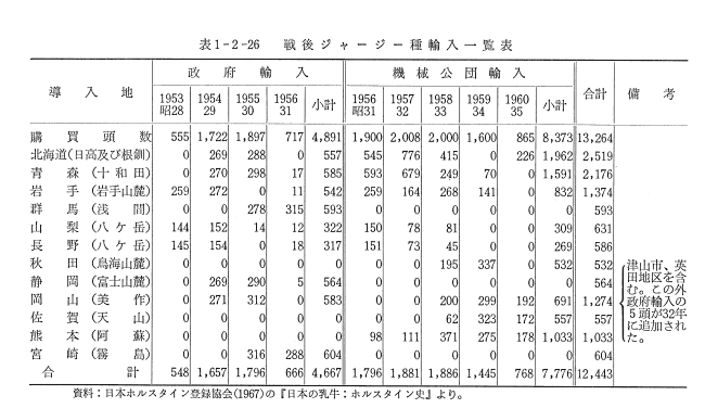 このようにしてジャージー種は,昭和28年(1953)から計画的に輸入されることになった。当初,3カ年はパイロットプランとして,国が直接購買し,国有貸付牛として,4,891頭をアメリカ,ニュージーランド,オーストラリアから輸入した。農林省(国有)の事業が打切りとなったあとも導入希望が強かったので,昭和31年(1956)からは世界銀行の借款によって,農地開発機械公団がこれを輸入し,国の指定地区に売却した。公団扱いのジャージー種は昭和35年(1960)まで8,373頭になった。