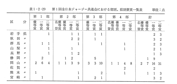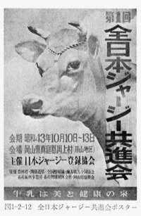 昭和43年(1968)10月10日〜13日,ジャージー種導入15周年を記念して,第1回全日本ジャージー共進会が蒜山で開催された。北海道,青森,岩手,秋田,群馬,山梨,長野,静岡,岡山,佐賀,熊本,宮崎,の各県から100頭のジャージー種が出品されたが,表1−2−29のとおり本県の出品牛は各部において上位を占め,日本一の生産地として名声を高めた。このとき川上村小学校講堂において,第4回全日本ジャージー大会が挙行され,多くの参会者が見守る中で,情勢報告がなされ,ジャージー酪農振興の基本対策を中心に議事が進められた。