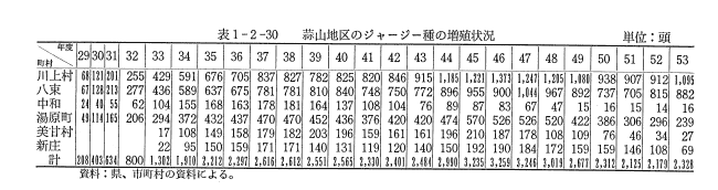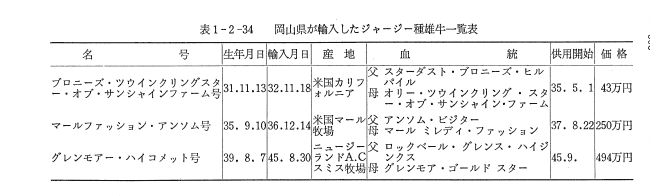 本地域には国有貸付制度によるもの450頭,世銀融資によるもの559頭のジャージー種が,昭和35年(1960)まで輸入されたのであるが,その後,自己資金によって昭和39年(1964)にはニュージーランドから98頭,同43年(1968)にアメリカから10頭,同45年に64頭(内1頭雄),同49年(1974)に2頭,同53年(1978)に38頭 を輸入し,全部で1,221頭を輸入した。アメリカ産のものは大型で,泌乳性は高かったが,体型は斉一でなかった。オーストラリア産は泌乳量が少く,体型資質も均一性を欠き,人気がなかった。ニュージーランド産はやや小型であったが,体型が整っており能力が高かった。とくに昭和39年(1964)に導入した牛は,全般に泌乳能力が優れていたため人気がよく,以後おもにニュージーランドから輸入するようになった。