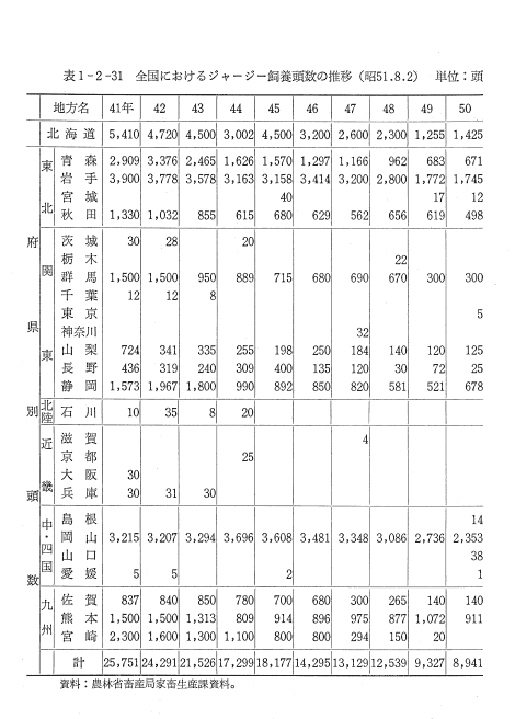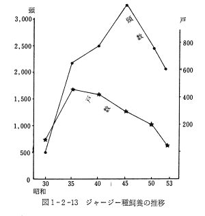 図1−2−13および表1−2−30のとおり,昭和45〜46年(1970−71)まで順調に伸びたジャージー種は,その後減少傾向となって,現在(昭和53年)2,328頭となった。しかし,国内では本県が最も多く,資質のよいことでも有名である。飼育戸数は昭和35年(1960)を頂点に減少傾向を示した。従って昭和33年(1958)の経営規模1戸当たり平均2.2頭は,昭和52年(1977)には8.9頭となった。