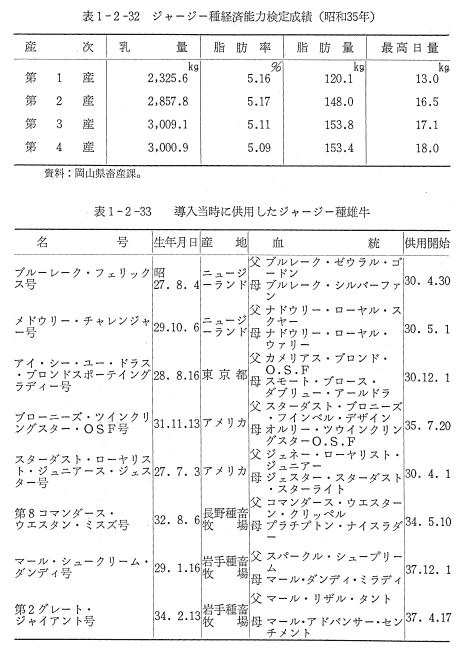 当初に輸入されたジャージー種は,船輸送途中,又は検疫期間中に分娩したものもあり,これらは泌乳能力が低かった。また輸入牛は妊娠しているものが多く,シーズン種付で,種付月齢の不明のものがほとんどであった。中には若齢で種付されたものがかなり多かった。その上環境が激変したため,泌乳量が少なく,ジャージー種は乳量が少ないという悪評が広まった。しかし産次が進み,飼養技術が改善されるに従って,漸次産乳成績は向上した。昭和31年(1956)から35年(1960)までジャージー種経済能力検定成績を行なったが,最終年における成績は表1−2−32のとおりであった。