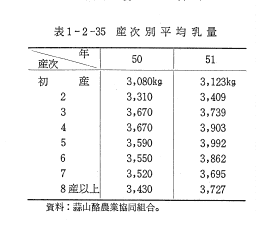 キロであった。平均脂肪率は,4.8%である。最高乳量は,5産の315日搾乳で,7,289キロ(昭和51年(1976)6月29日分娩)であって,ホルスタイン種に匹敵するほどの乳量であった。高年齢では産次11産,335日搾乳で,4,098キロのものもあり,また12産で検定中という寿命の長いものもいる。また,同組合は,4,000キロ以上の泌乳能力のあるものを保留しているが,53年度末までに302頭となっている。