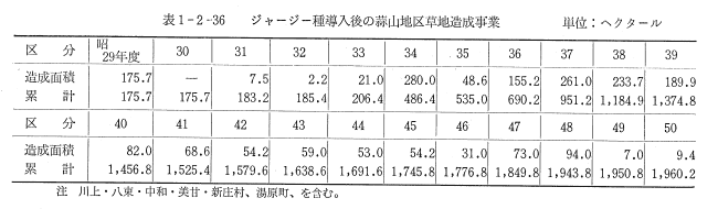 昭和34年度,美作大規模草地改良基本調査が当時の農林省の農地局,農地事務局,振興局,中国農業試験場などの諸機関の協力のもとに実施され,表1−2−36のように昭和50年(1975)までに,1,960ヘクタールの広大な草地が造成された。またこの地帯は水田単作であったが,現在では裏作にイタリアンライグラスを作付けするようになった。