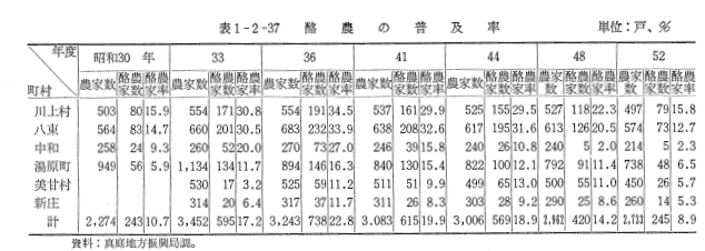 昭和29年(1954)ジャージー種導入後,川上,八束,中和,湯原の各町村には酪農家が着実に増えた。昭和33年度においては,新たに美甘,新庄の両村がジャージー地区に加えられた。当地方の農家戸数,ジャージー種導入当初約3,400戸であったが,同40年(1965)ごろから多少減少傾向を示し,他地域同様,同48年(1973)のオイルショック以降は大きく減少し,同52年度末には2,733戸に減少した。この間酪農家戸数は,同33年度末595戸であったものが,同38年(1963)に724戸まで増加し,その後昭和45年(1970)まで毎年約20戸ずつ減少した。ところが同48年(1973)に100戸,同49年(1974)に60戸,同50年(1975)に100戸と大幅な減少をみた。すなわち,48年(1973)以降,小規模経営者は,後継者不足,経営拡大の基盤の確保が困難,飼料費の高騰,ふん尿の処理ができない等の理由により脱落していった。また乳質改善のためにバルククーラーの設置が奨励され,その導入は経営拡大を前提とすることになり,規模拡大の困難な農家に酪農を捨てさせる結果となった。