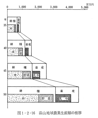 蒜山地域の総面積に占める山林原野の割合は,85パーセントと大きく,しかも山林原野の60パーセント以上が公有林で,その大半が採草地(入会地)として利用されていた。しかし,その生産性は非常に低かった。明治以来夏期における農民の日課に草刈りがあった。農民は毎日未明に起きて役牛に車を曵かせて山に登り,1年中の飼料と敷草を刈っていた。二段刈りと言って,午後再び山の登り,水田の堆肥用の草を刈っていた。このような過重な農作業が5月から100日間も続けられた。このため農民に過労から起こる疾病が多かったという。このような地域が国の集約酪農地域の指定をうけ,ジャージー種が導入され,その粗飼料自給のために巨費が投入され,改良草地の造成が行われたのである。