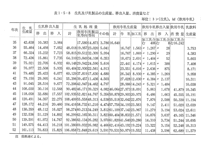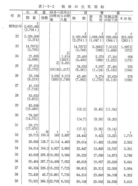 表1−5−2は農林省統計表による昭和戦後期における生乳の需給状況である。