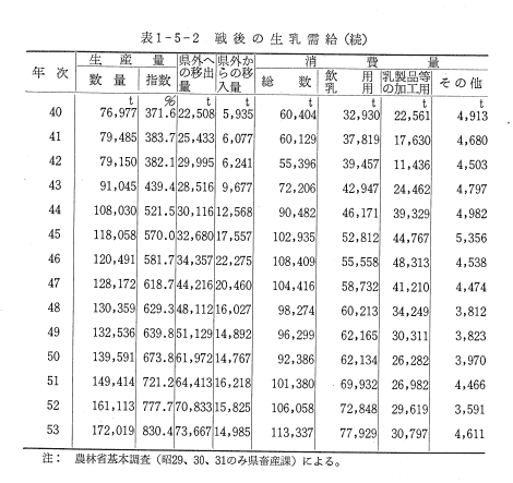 戦時中は乳用牛頭数約3,000頭足らずで推移していたが,昭和21年(1946)の終戦の混乱により,1,766頭と激減した。その後昭和25年(1950)に3,008頭に回復した。当時の乳牛は22パーセントが牛乳屋で飼われ,残り78パーセントが酪農家で飼われていた。県衛生課では牛乳の販売許可のために「牛乳搾取処理販売営業」の鑑札を与え,酪農家には「牛乳搾取業」の鑑札を与え農乳と称した。終戦の混乱と人手不足,飼料不足,牛価の暴騰等によって乳用牛は激減した。特に牛乳屋が姿を消し,酪農家が残った。