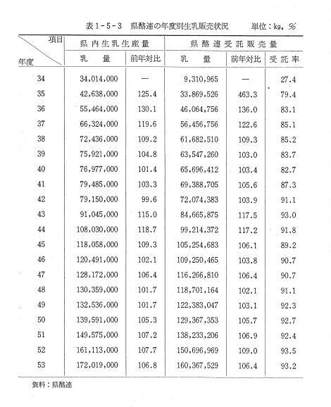 岡山県酪連の創設以来の生乳の受託販売量は表1−5−3のとおりで,その受託率は,昭和30年代には80パーセント台で推移したが,40年代以降90パーセント台を維持している。