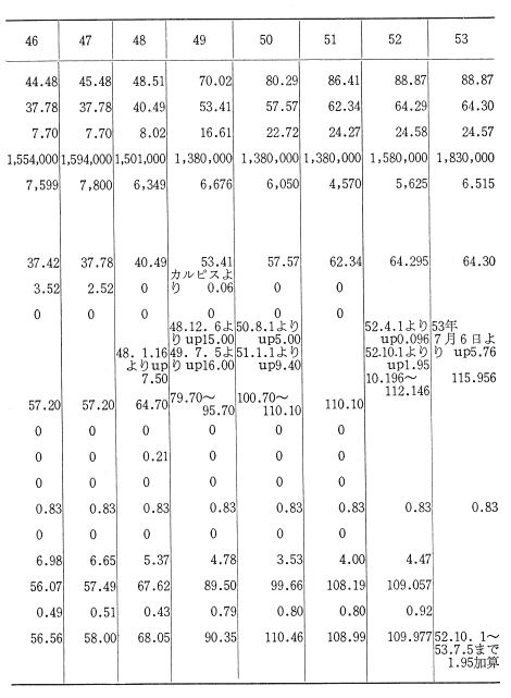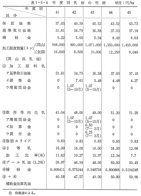 昭和41年(1966)から,加工原料乳生産者補給等暫定措置法(不足払法)による補給金は表1−5−4の乳価明細表により支払われた。保証価格と基準取引価格は,国が畜産振興審議会酪農部に諮って決めるもので,その差額が補給金となる。この補給金を給付する対象が加工限度数量である。