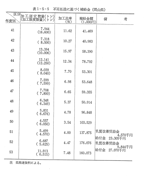 不足払法に基づく補給金は,毎年度表1−5−5のように給付された。加工認定数量とは,知事が指定生乳生産者団体が加工原料乳として扱った乳量であることを認定した数量のことである。昭和52年度まではこの加工認定数量が,加工限度数量以下で推移していたが,昭和53年度から限度数量をオーバーすることとなった。昭和51・52年度では生乳生産を奨励する意味で乳質改善奨励金,給付金が支給された。