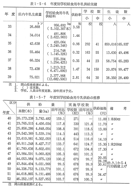 この事業は,酪農振興法,および学校給食法によって表1−5−6および表1−5−7のように実施せられた。県は年度計画を作成し,国の承認を得て,県酪連と謀り,業者を選定し,小中学校に対して給食用牛乳を供給した。