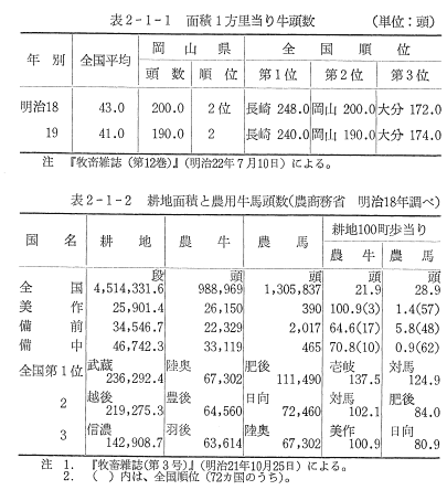畜牛は,岡山県の重要物産であって,明治中期には,ほぼ9万頭前後で推移していたが,日露戦役(明治37年)の勃発により,一時食いつぶし現象が起り,8万頭余りに減少している。岡山県の牛の飼養頭数は,全国的にたえずトップグループに属していて,その飼養密度も高かったことが,表2−1−1と表2−1−2により証明できる。