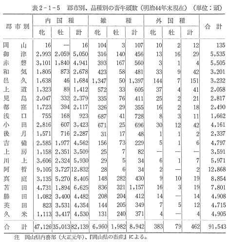 明治44年(1911)末現在における郡市別畜牛頭数は表2−1−5のとおりで,内国種の多い備中の中北部は,いわゆる和牛の主産地であり,県南部および苫田郡を中心とする作州地域は,乳用目的の雑種の比率が比較的高かった。
