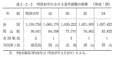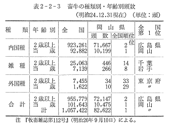 つぎに,明治33年(1900)以後と,それまでとに年代を区分して,洋種の導入などについて述べることとする。ここで断っておかなければならないことは,岡山県においても時流に従って洋種牛が導入されているけれども,他県に比較すれば,洋種導入の度合いは少なく,その影響を余り受けることなく今日の和牛(肉用牛)となっているということである。