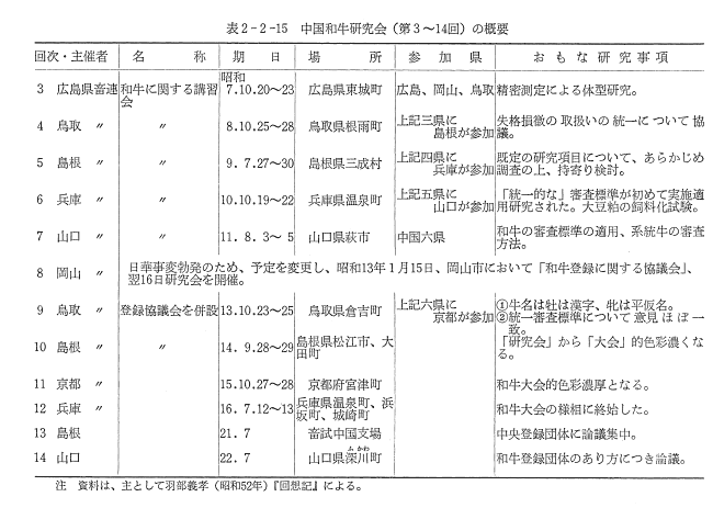 つぎに研究会の概要を,回を追って述べることにする。なお,第4回の研究(昭和8年 鳥取県根両町現日野町)において,「中国和牛研究会」を常置することとなり,会則がつくられた。