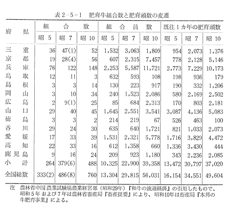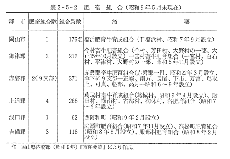 岡山県(昭和11年)の『岡山県要覧』によれば,肥育牛は,県南部地方農家の副業として,県ならびに畜産組合連合会が助成していて,近年長足の進歩をとげ,肥育組合20,組合員800を算し,肥育頭数3,000頭に及び,肉牛の声価も高くなっている,とある。