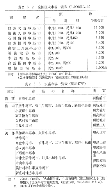 前掲の文献によって,明治17年3月5日『全国牛馬市場調査表』(農務顛末,第4巻)による明治15年(1882)の牛馬取引頭数をもとに挙げられた全国の巨大市場は表2−6−2のとおりで,これらはすべて生産地に立地し,明治10年代には消費地市場はまだ発達していなかった。古くから和牛の主産地であった中国山地は,巨大市場の密集地で,とくに大山牛馬市が1頭地をぬきんでて大きかった。また,中国山地の市場のほとんどが牛馬市であったが,大山と久井の牛馬市のほかは牛が主体で,馬はごく少数に過ぎなかった。そして,大市場の分布は,山陰の石見−出雲の山間部−伯耆の西部山間部−作州の出雲街道ぞいというように,生産地から古い街道筋に栄えていた。
