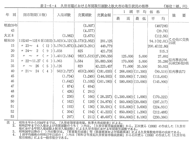 春秋2季の市場は,中国山地の牧畜形態の変化,すなわち,粗放的放牧から子牛産地帯として確立されるに即応して,久世市場で,取引きされる牛には質量両面で変化が生じた。すなわち,@成牡牛の減少とその価格の低下,A牝牛および子牛の増加とその価格の上昇,B入場頭数,総取引き価格の減少という3つの現象が顕著となり,年間の入場頭数に占める秋市の比重が低下し,秋市の特色がしだいに失われて行った。また,入場頭数の減少の結果,開市期日も短くなった。