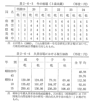 ,明治20年代ごろの牛の相場は,表2−6−5のようであった。明治19年(1886)の牛価が1円となっているのは,次のことで理解できよう。すなわち,明治17年(1884)は牛価の暴落した年で,中国農業試験場農業経営部(昭和29年)の『和牛の流通経済』によれば,同年は「物価大いに下落,牛馬1頭1円に至る」ということであった。
