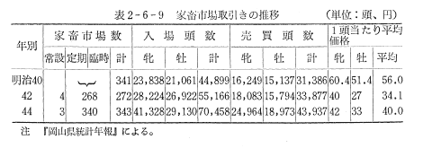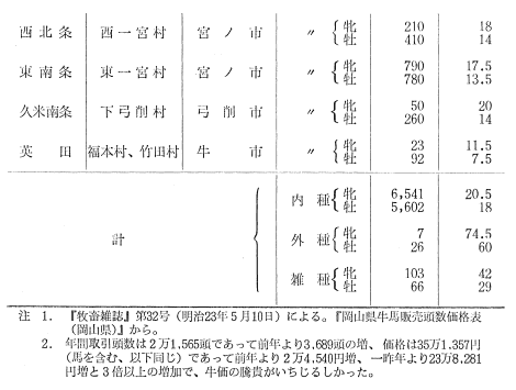 明治21年(1888)下期における岡山県内のすべての家畜市場についての取引き実績が,『牧畜雑誌』第32号(明治23年5月)に掲載されている。当時の家畜市場の名称,所在地名,取引き頭数および価格を知るうえに貴重な資料であるので,表2−6−7に掲げることにする。
