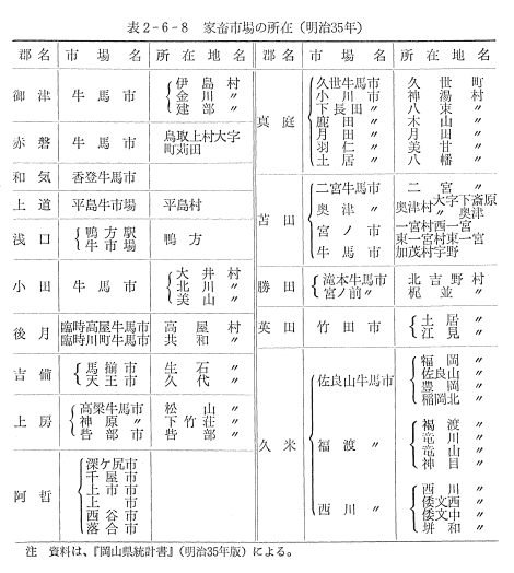 岡山県統計書(明治35年)には,同年における郡市別の牛馬市場取引成績が示されている。これにより家畜市場の所在地を示せば表2−6−8のとおりである。