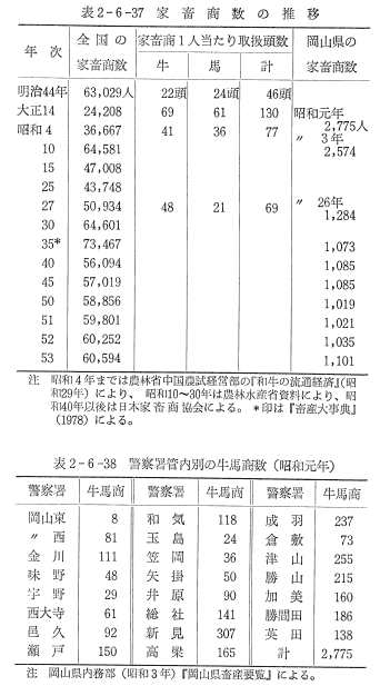 昭和元年(1926)における,所轄警察署管内別の牛馬商数は,表2−6−38に示すとおりであって,その数により当時の牛馬の主産地の想像もつけられよう。昭和26年(1951)における個人,法人の別を見れば,岡山県では1,284中1,281が個人であって,しかもその96%が使用人を持たない業者であった。全国的に見た専兼業の別は,その9割が兼業であって,農業との兼業が7割以上を占め,ついで食肉業の9%となっていた。昭和53年(1978)における岡山県の家畜商数1,101名はすべて兼業となっている。