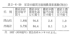 つぎに,取り扱う家畜の種類(昭和27年)は,そのほとんどが牛を主として取り扱っている。全国的に見た取扱い規模別(昭和31年)家畜商数は,50頭未満の零細なものが過半数を占めていた。これらはいずれも昭和30年ごろの統計であるので,その後,飼養規模の拡大,系統共販の推進,家畜の種類の変遷などの要因により,これらの傾向には当然かなり変化があることが考えられる。つぎに当時の農家が家畜を購入する場合,どのようなルートでこれを行なったかというのが表2−6−39である。岡山県の場合は,全国平均よりも多く家畜商を通じて買い入れ,反対に農協を利用したものは全国平均より低率であった。