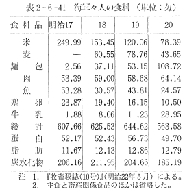 食肉の組織的な消費は,軍需としての性格をもって始められた。まず,明治2年(1869)に海軍において栄養食として牛肉を採用した。明治19年(1886),陸軍省においては各兵営兵率食料改良の目的をもって,京都府ほか15県に対して,牛の購入について照会を出した。明治17,8年(1884−85)ごろ,軍隊帰りから一般市民に肉食が普及するようになり,一般の牛肉消費が伸びた。このごろの海軍々人の食料を参考までに示すと表2−6−41のようであった。