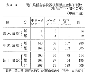 明治37年(1904)に御津郡伊島村(現岡山市)に設置された岡山県種畜場には,同年から当時新品種であったバークシャー種々豚を,翌38年(1905)にはヨークシャー種豚を併せて飼養して,生産子豚の払下げを毎年度行い,一般での飼育を奨励したが,開場から昭和2年(1927)に至る24年間には表3−3−1のように累計409頭の払下げを行っている。なお,この間明治39年(1906)に県立商業学校,同40年(1907)県立師範学校,同41年(1908)には勝田郡英田郡組合立農林学校(現勝間田農林高校)へそれぞれバークシャー種豚の払下げを行い,教育機関を通じての啓発,普及を図っている。