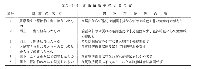 すなわち,当時一般的に養豚飼料として用いられ,また問題もあったと思われる醤油粕をいろいろの割合で給与して飼育し,これにより育成された肉豚7頭を原料として,ハム,ベーコン,ラードの製造を行い,その製品の品質や収支を比較している。そして,昭和3年(1928)には,大正14年(1925)から昭和2年(1927)まで3カ年間行った醤油粕給与による飼養試験の総括として,給与割合や飼い直し技術についての試験を行い,つぎのような成績を得,これらの肉を用いての加工試験も同時に実施している。