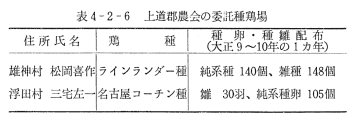 上道郡農会の事業の一つに種禽設置事業があった。これにより優良種禽の繁殖を図るために,表4−2−6の2カ所に委託して,種卵および種雛の配付を行なった。
