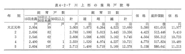 川上郡では,家禽の飼育が農家の副業として有利なことは,周知のとおりであるのに,本郡では盛んでないのは残念であるとしている。大正初年における川上郡内の飼育戸数等は表4−2−7のとおりであった。