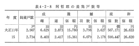 阿哲郡では,鶏の飼育は盛んではなく,美穀村(現新見市),矢神村(現哲西町)等に優良種をみる程度で,ほとんどは雑種である。郡農会は各町村に1カ所の種鶏場を設けて,鶏の改良を図ろうとしているが,大家畜が中心であるため,飼料の供給が充分でないうえ,交通事情が悪いので,これらの点を改善すれば有望な副業となるのであろう。郡農会は,レグホーン,名古屋,ミノルカ,アンダルシャン,プリモースロック種等を奨励品種として,普及に努めている。大正11年(1922)と同15年(1926)の飼育戸数は表4−2−8のとおりであった。