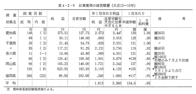 大正12年(1923)から4カ年にわたり愛知,千葉,香川,岡山,福岡の5県において,副業的な養鶏経営についての経営収支を農林省畜産試験場が調査した成績の概要は表4−2−9のとおりである。