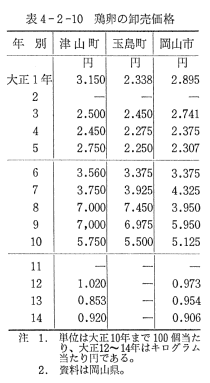 大正年代における岡山県下の鶏卵卸売価格は表4−2−10のとおりである。これからすると,岡山市の鶏卵が最も安く,続いて,玉島町(現倉敷市玉島),津山町(現津山市)の順となっている。これは飼育羽数の差が現れたものと考えられる。また,最初に述べている全国的な卵価の動向として,大正7年(1914)に卵価が高騰したとしているが,本県では,大正8,9年(1919−20)に,それも玉島町,津山町のみが高騰しているのが不思議である。