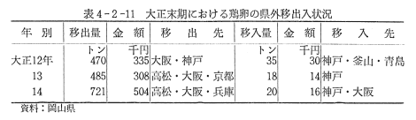 大正末期における鶏卵の県外移出入動向を見ると表4−2−11のとおりであるが,大正2年(1923)に釜山,青島から鶏卵を輸入しているのが特徴的な動きであろう。また,阪神地区への移出入の動きもおもしろい。